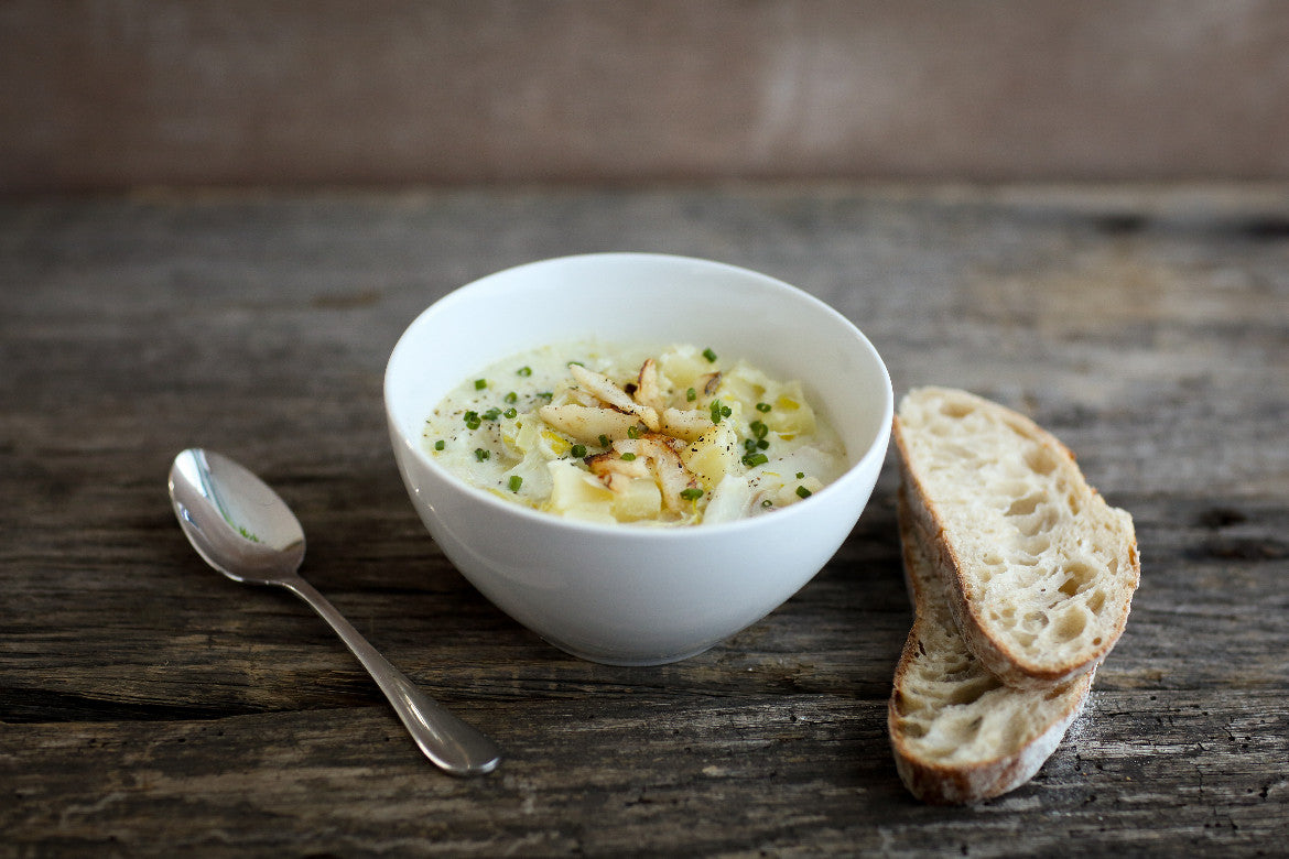 - Season the soup to taste with salt and freshly ground pepper. Top each bowl with the crispy haddock mixture, a sprinkling of chives and enjoy with a slice of sourdough bread.